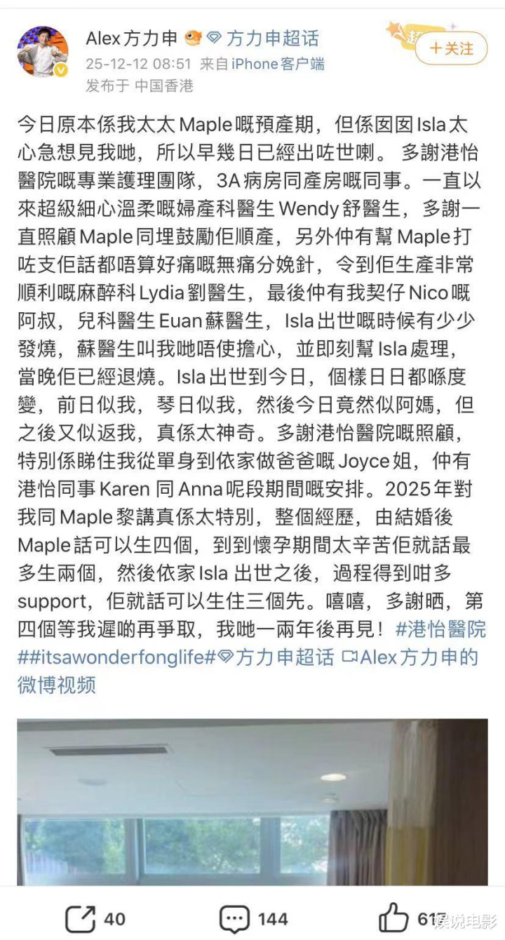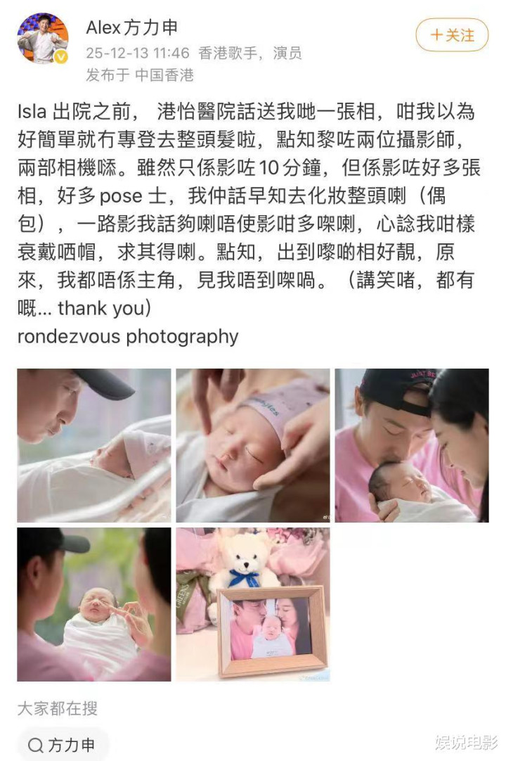 昨天方力申发文官宣女儿出生,分享妻子提前生产的经历,感谢港怡医院医护人员的照顾,还提到妻子在生产时打了无痛分娩针,过程顺利。